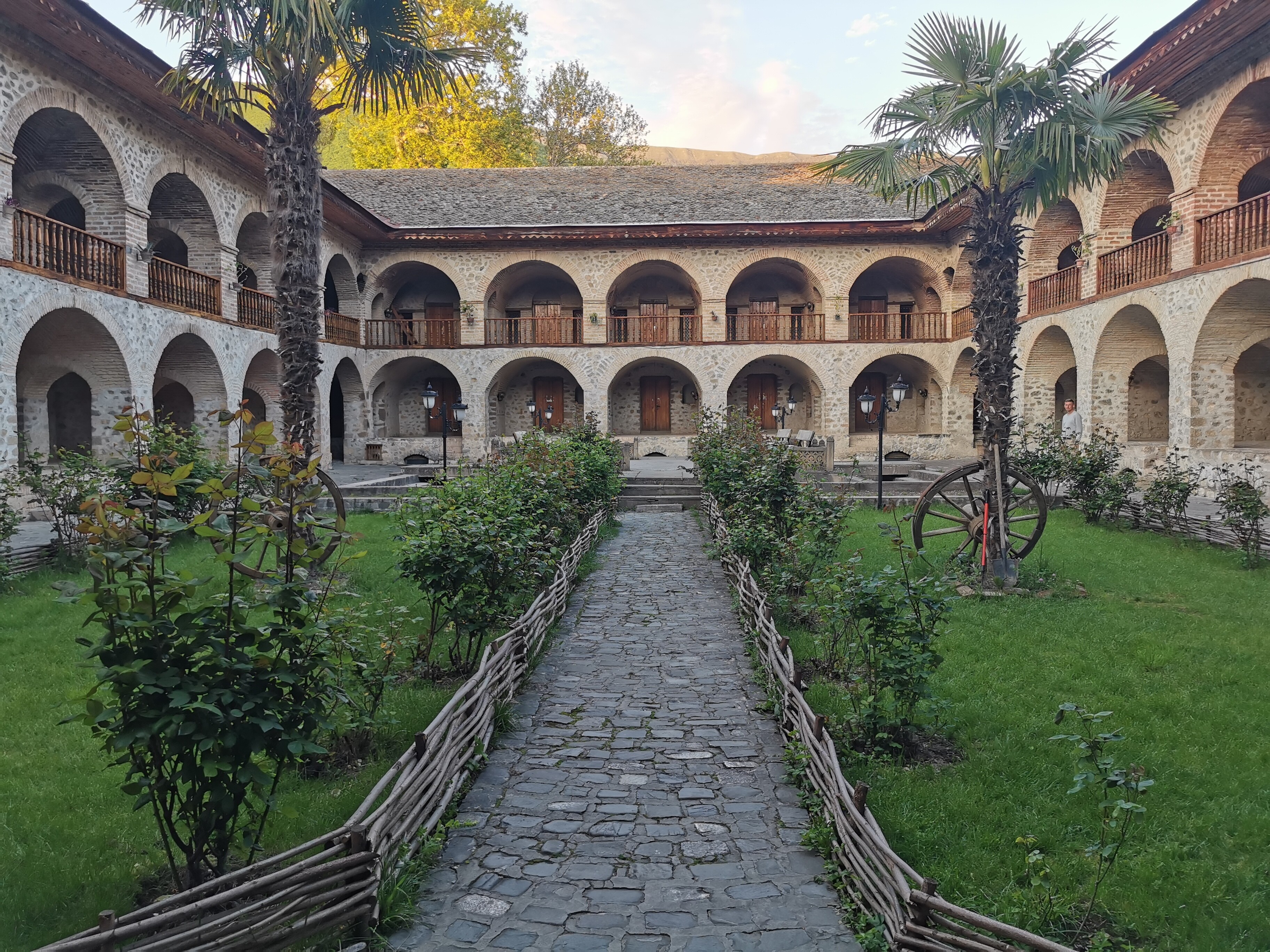 Zwiedzanie Şəki – Pałac Chanów – absolutnie zachwycający. Misterne wzory, witraże şəbəkə, malowidła – zdecydowanie warto. (Bilet 9 AZN, zakaz robienia zdjęć, można wykupić audioprzewodnik lub usługę przewodnika, nas oprowadziła i odpowiedziała na wszystkie pytania pani, która pilnowała kierunku zwiedzania i przestrzegania zakazu fotografowania). Obok centrum ABAD i pracownie artystyczne. Tutaj można własnoręcznie złożyć mały witraż şəbəkə – co obudziło w autorze skrajne emocje: od ekscytacji, przez irytację, po kapitulację i prośbę o pomoc mistrza. Wszystko warte uwagi i odwiedzenia. Wstęp wolny. Karawanseraj – warto zajrzeć chociaż na patio i poczuć klimat dawnego miejsca odpoczynku karawan.